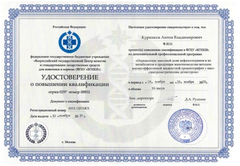 Ведущий химик отдела химических исследований ФГБУ «Саратовская МВЛ» прошел курсы повышения квалификации в ФГБУ «ВГНКИ», г. Москва, по теме: «Определение массовой доли цефалоспоринов и их метаболитов в продукции животноводства методом высокоэффективной жидкостной хроматографии с масс-спектрометрическим детектором». Повышение квалификации проходило с 19 по 20 ноября 2020 г.