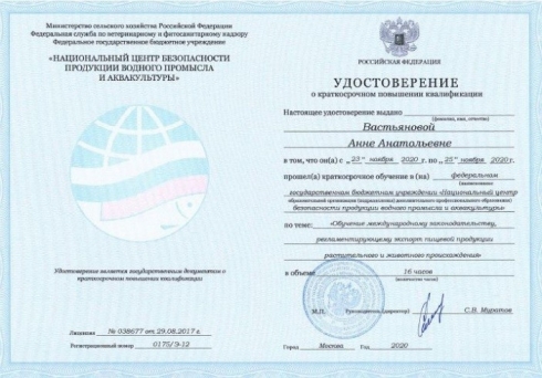 В рамках федерального проекта «Экспорт АПК» 23 ноября 2020 года ФГБУ «Национальный центр безопасности продукции водного промысла и аквакультуры» провело двухдневный семинар для специалистов подведомственных Россельхознадзору Учреждений на тему: «Обучение международному законодательству, регламентирующему экспорт пищевой продукции растительного и животного происхождения». Повышение квалификации проводилось в форме дистанционного обучения.