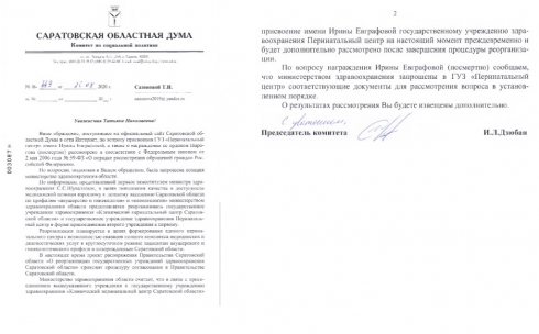 Обращалась С ИЮЛЯ 2020 ГОДА к губернатору Радаеву В.В., в министерство здравоохранения , к Седовой И.В., в областную Думу к Дзюбану И.Л. и Литневской Ю.М., в Региональную общественную приемную Председателя партии "ЕДИНАЯ РОССИЯ" по вопросу увековечивания памяти врача акушера-гинеколога Ирины Евграфовой и награждении её орденом Пирогова посмертно и присвоении её имени Перинатальному центру.
