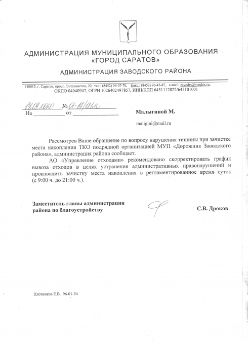 Неоднократно обращалась по телефону горячей линии и через электронную приемную Филиала АО «Управление Отходами» в г. Саратове (у этой организации заключен договор на вывоз мусора с МУП "Дорожник Заводского района"), с просьбой изменить график вывоза мусора на дневное время, прислали официальный ответ, что составлен акт о нарушении времени транспортирования коммунальных отходов, с дальнейшим привлечением к ответственности. А также обращалась в администрацию Заводского района г. Саратова, пришел ответ (во вложении) о том, что нужно скорректировать график вывоза мусора и проводить зачистку с 9.00 до 21. Было отправлено обращение Уполномоченному по правам ребенка, но, к сожалению, ответ не поступил… Прокуратура переправила мое обращение в Роспотребнадзор...