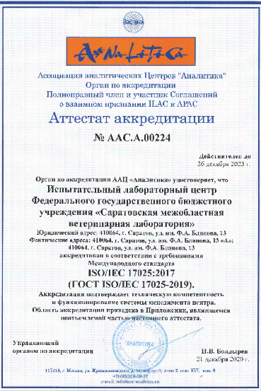 3-4 декабря текущего года состоялась процедура инспекционного контроля деятельности Испытательного лабораторного центра (ИЛЦ) ФГБУ «Саратовская МВЛ» с проверкой возможности расширения области аккредитации и с оценкой возможности перехода на соответствие требованиям ГОСТ ISO/IEC 17025-2019 экспертом Органа по аккредитации Ассоциации аналитических центров «Аналитика». Проверка проходила в удаленной форме. Программа оценки включала следующие пункты:● рассмотрение документов системы менеджмента ИЛЦ;● оценка ведения записей по проведению испытаний;● состояние материально-технической базы, метрологическое обеспечение средств измерений и испытательного оборудования ИЛЦ;● оценка качества применяемых в ИЛЦ стандартных образцов,материалов;● наличие необходимой документации, регламентирующей методикипроведения испытаний;● оценка квалификации персонала;● анализ результатов внутреннего лабораторного контроля точности результатов испытаний и участия в программах МСИ;● анализ сведений по внутренним аудитам, управлению рисками;● оценка документирования верификации методик.По результатам проверки экспертом составлен акт с выводами — Испытательный лабораторный центр ФГБУ «Саратовская МВЛ» соответствует требованиям ISO/IEC: 2017 (ГОСТ ISO/IEC 17025-2019) «Общие требования к испытательным и калибровочным лабораториям», «Политике Органа по аккредитации ААЦ «Аналитика» при проведении испытаний в утвержденной области аккредитации (ОА) в соответствии с аттестатом аккредитации АА.С.00224, в том числе дополнительно расширенной на ОА, включающей 87 методик. Аккредитация в международной системе подтверждает техническую компетентность и функционирование системы менеджмента Испытательного лабораторного центра ФГБУ «Саратовская МВЛ». В соответствии с областью аккредитации ИЛЦ учреждения проводит испытания пищевой продукции, продовольственного сырья, злаковых, зернобобовых и масличных культур, кормов на показатели качества и безопасности, включая остаточное количество пестицидов, в том числе глифосата и галоксифопа; лекарственных средств для ветеринарного применения на токсичность и пирогенность; биологического и патологического материала на выявление ДНК вируса АЧС, нодулярного дерматита и др.Для информации: ААЦ «Аналитика» является полноправным членом и участником Соглашений о взаимном признании ILAC – International Laboratory Accreditation Cooperation – Международного сотрудничества по аккредитации лабораторий и APLAC – Asia Pacific Laboratory Accreditation Cooperation – Азиатско-Тихоокеанского сотрудничества по аккредитации лабораторий. Соглашение ILAC подписано более чем 90 органами по аккредитации, включая органы по аккредитации Германии, Франции, Великобритании, США, Китая, Японии, Канады, Австралии, Индии, Бразилии и др. В России помимо ААЦ «Аналитика» Соглашение также подписано Федеральной службой по аккредитации.