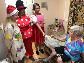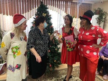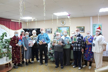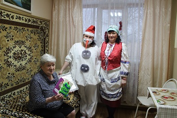 На следующий день проживающих и сотрудников ждал настоящий сюрприз – Сказочная Баба Мороз в сопровождении своего друга Снеговика отправилась на поиске своего супруга – Деда Мороза, не вернувшегося накануне. Шуточный сценарий, задорные конкурсы от души повеселили всех участников. Каждому достались подарки и новогодние поздравления, которые передали в учреждение Саратовское региональное отделение «Российское движение школьников», Федерация профсоюзных организаций Саратовской области и учащиеся школ города и МОУ "Гимназия №8".