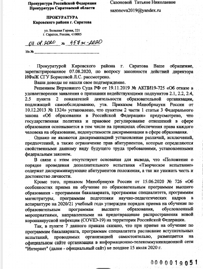 Ранее были получены ответы за подписью прокурора Пригарова А.В. по обращению о законности наличия оценки дикции для абитуриентов специальности Журналистика СГУ в дополнительном вступительном испытании "Творческом испытании", утвержденном 2 июля 2020 года директором ИФиЖ СГУ Борисовой Л.С.
