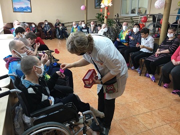 Хорошее настроение с утра всем проживающим в этот день обеспечила трансляция праздничных роликов на большой интерактивной панели, установленной в центральном холле, влюбленные передавали музыкальные подарки по внутреннему радио учреждения.