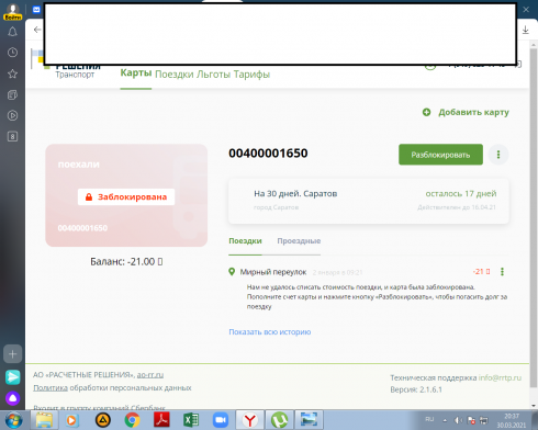 Пишу Вам, потому что в СГЭТ сказали общаться на горячую линию "Расчетных решений", а там такое впечатление, что вообще не понимают о чем речь. Дословно: Оплатите еще 21 руб и вам разблокируют карту. Провожу расследование дальше! Следующий оператор на горячей линии мне сказал, что на терминале в трамвае просто неправильно была выставлена дата и 2010 год! Поэтому по карте образовался долг за 2010 год! терминал номер № 22063889 трамвая № 3 и карта заблокирована. А если завтра опять кто-то не выставит правильно дату я так и будут дополнительно платить.