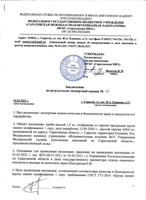 В соответствии с обращениями Управления Россельхознадзора по Саратовской области в марте 2021 года Органом инспекции ФГБУ «Саратовская МВЛ» проведены 4 инспекции в виде экспертных оценок качества зерна и продуктов его переработки.