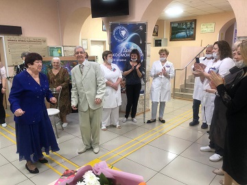 Поздравить Любовь Владимировну с юбилеем собрались друзья и сотрудники в холле 1 этажа. Настроение всем собравшимся задавали музыкальные открытки и именинница, не удержавшись, пустилась в пляс вместе со своим супругом.