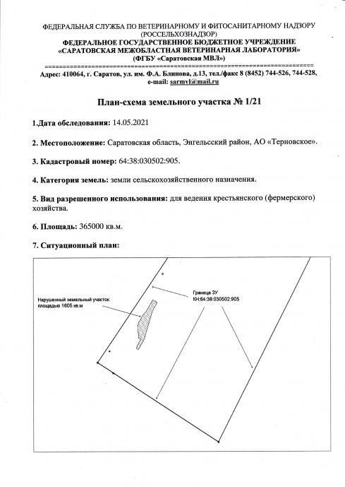 В соответствии с обращениями Управления Россельхознадзора по Саратовской и Самарской областям в мае 2021 года отделом инспекции ФГБУ «Саратовская МВЛ» проведено геодезическое обследование 2-х земельных участков, расположенных на территории Энгельсского и Озинского районов Саратовской области.На основании обращений заказчика целью проведенных обследований стало установление точных границ и площади территорий с нарушенным плодородным слоем почвы на основании геодезических измерений.Измерения проводились с помощью геодезической спутниковой GNSS-аппаратуры, прошедшей поверку в установленном порядке. GNSS-аппаратура представляет собой прибор, созданный для определения местоположения при помощи данных от глобальных спутниковых навигационных систем.Перед началом обследований заказчиком были предоставлены кадастровые планы территории, ставшие исходной информацией для указанных процедур.В ходе геодезических измерений специалистом отдела инспекции были определены поворотные точки границ и площади нарушенных территорий.В результате проведенных обследований подготовлены 2 плана-схемы земельных участков, направленные в Управление Россельхознадзора по Саратовской и Самарской областям.
