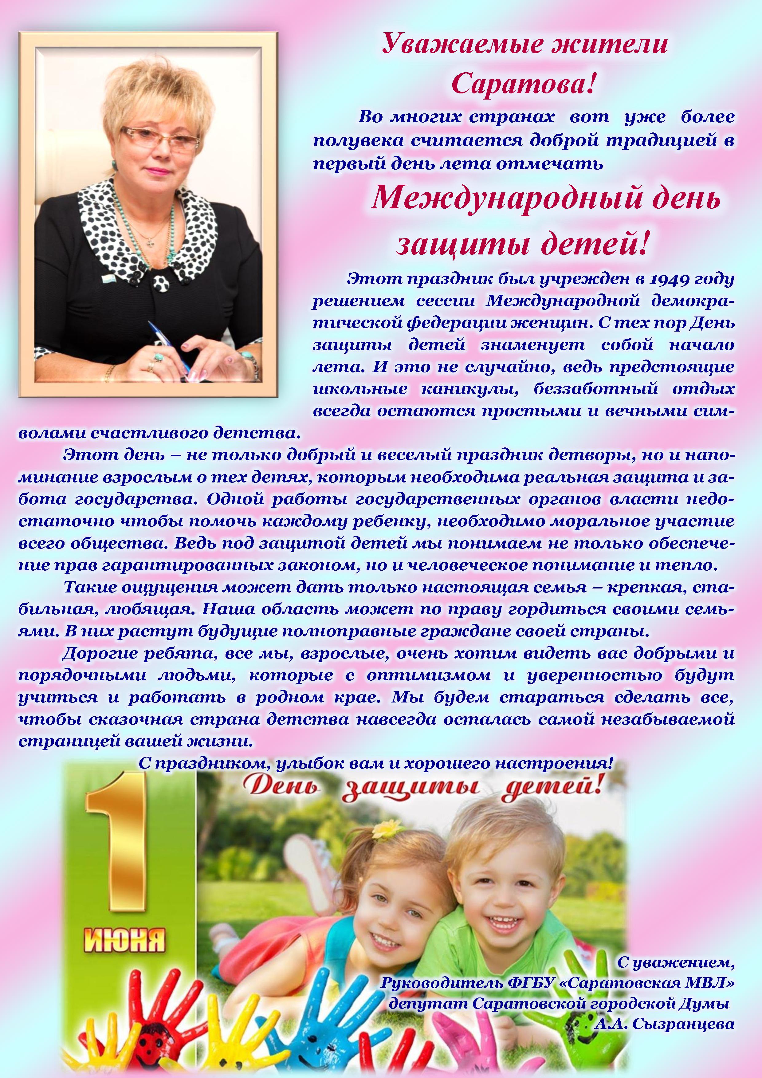 Александра Сызранцева поздравляет жителей Саратова с Международным днем защиты детей
