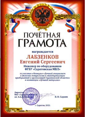Согласно оценкам конкурсной комиссии, Почетной грамотой ФГУ «Саратовский ЦСМ им. Б.А. Дубовикова» в номинации «Лучший метролог» награжден инженер по оборудованию отдела стандартизации и метрологии ФГБУ «Саратовская МВЛ» Лабзенков Е.С.
