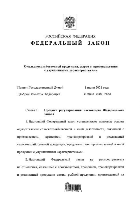 Президент РФ подписал Федеральный закон от 11 июня 2021 г. № 159-ФЗ “О сельскохозяйственной продукции, сырье и продовольствии с улучшенными характеристиками”.Федеральный закон направлен на повышение доступности для населения сельскохозяйственной продукции, сырья, продовольствия, промышленной и иной продукции с улучшенными характеристиками и устанавливает правовые основы осуществления сельскохозяйственной и иной деятельности, связанной с производством и обращением такой продукции.Данным законом устанавливаются требования к производству, хранению, транспортировке и реализации улучшенной сельскохозяйственной продукции, в том числе вводятся запреты на применение клонирования и методов генной инженерии, генно-инженерно-модифицированных и трансгенных организмов, ионизирующего излучения, запрет на использование упаковки, потребительской и транспортной тары, которое может привести к загрязнению названной продукции.Согласно Федеральному закону подтверждение соответствия улучшенной сельскохозяйственной продукции осуществляется в форме добровольной сертификации в соответствии с требованиями и в порядке, которые установлены законодательством Российской Федерации о техническом регулировании, в целях установления соответствия улучшенной сельскохозяйственной продукции документам по стандартизации на эту продукцию.Документом регулируются вопросы, касающиеся создания и ведения единого государственного реестра производителей улучшенной сельскохозяйственной продукции, государственной поддержки производителей этой продукции, информационного и методического обеспечения в сфере производства улучшенной сельскохозяйственной продукции, и другие вопросы.