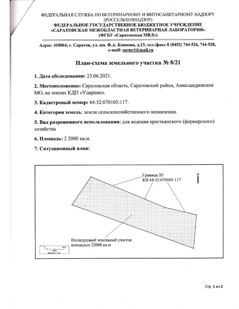 В соответствии с обращением Управления Россельхознадзора по Саратовской и Самарской областям в июне 2021 года отделом инспекции ФГБУ «Саратовская МВЛ» проведено геодезическое обследование земельного участка, расположенного на территории Саратовского района Саратовской области.