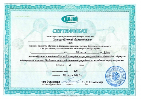 Специалисты ФГБУ «Саратовская МВЛ» 6 июля 2021 года приняли участие в семинаре на тему «правила и методы отбора проб пестицидов и агрохимикатов для исследований на содержание действующего вещества. Требования техники безопасности при работе с пестицидами и агрохимикатами» в объеме 8 часов.Целью данной учебной программы является приобретение слушателями новых профессиональных навыков.Программа семинара была реализована в заочной форме с применением дистанционных технологий.Семинар состоял из следующих этапов:• Прослушаны лекции по темам семинара;• Вебинар — слушатели имели возможность задать вопросы преподавателю в соответствующем разделе и получить на них ответы в ходе вебинара.По итогам семинара трем специалистам ФГБУ «Саратовская МВЛ» были выданы сертификаты об обучении.