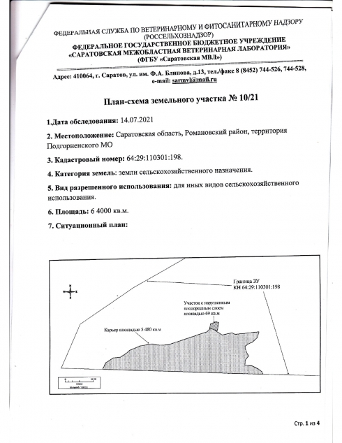 В соответствии с обращением Управления Россельхознадзора по Саратовской и Самарской областям в июле 2021 года отделом инспекции ФГБУ «Саратовская МВЛ» проведено геодезическое обследование земельного участка, расположенного на территории Романовского района Саратовской области.Целью проведенного обследования стало установление точных границ и площади территории с нарушенным плодородным слоем почвы.Измерения проводились с помощью геодезической спутниковой GNSS-аппаратуры, прошедшей поверку в установленном порядке. Благодаря этой системе всю информацию можно получать без видимых ориентиров за короткое время и с высокой точностью.Перед началом обследований заказчиком был предоставлен кадастровый план территории, ставший исходной информацией для данной процедуры.В ходе геодезических измерений специалистом отдела инспекции были определены поворотные точки границ и площади нарушенной территории.По результатам проведенных измерений подготовлена План — схема земельного участка и направлена в Управление Россельхознадзора по Саратовской и Самарской областям.