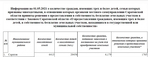 По данным на 21 мая 2021 года количество многодетных семей, имеющих право на получение земельного участка: