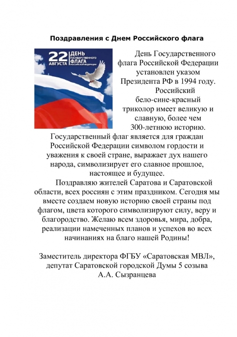 Поздравительные слова в честь Дня Государственного Флага РФ произнесла депутат Саратовской городской Думы Александра Сызранцева. Александра Алексеевна поздравила всех присутствующих с этим замечательным праздником. "Желаю нашим соотечественникам мира, добра, достатка и безграничного счастья! Пусть наша страна только процветает и становится все сильнее с каждым годом!" - добавил парламентарий. Поздравления прозвучали от председателя комитета по культуре, общественным отношениям и информационной политике Саратовской областной Думы, директора ДК «Россия», заслуженного работника культуры РФ Ольги Петровны Сынкиной. На мероприятии присутствовали также руководитель исполнительного комитета Партии Единая Россия Елена Шевченко и члены первичного отделения "ул. Блинова, 13".