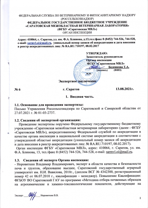 В соответствии с поступившим обращением Управления Россельхознадзора по Саратовской и Самарской областям в августе 2021 года Органом инспекции ФГБУ «Саратовская МВЛ» проведена инспекция в виде почвоведческой экспертизы.
