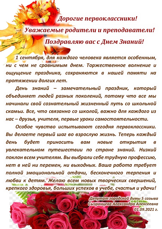 Депутат Александра Сызранцева поздравляет первоклассников, родителей и педагогов с Днем знаний
