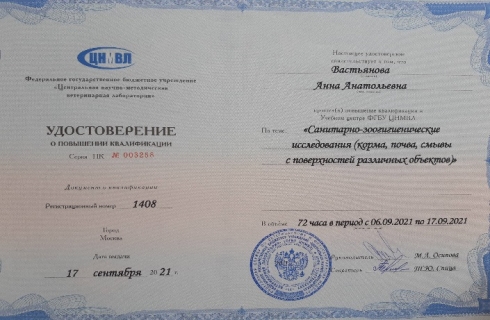 С 6 по 17 сентября 2021 года начальник отдела ветеринарно-санитарной экспертизы прошла стажировку в ФГБУ «ЦНМВЛ» по теме: «Санитарно-зоогигиенические исследования (корма, почва, смывы с поверхностей различных объектов)», в количестве 72 часов.
