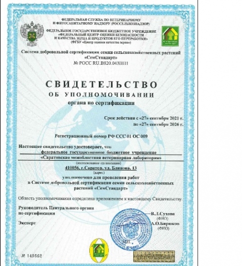 В сентябре 2021 года ФГБУ «Саратовская межобластная ветеринарная лаборатория» успешно прошло переаккредитацию органа по сертификации и уполномочено для проведения работ в системе добровольной сертификации семян сельскохозяйственных растений «СемСтандарт», что подтверждается Свидетельством об уполномочивании органа по сертификации, регистрационный номер РФ ССС 01 ОС 09 от 27 сентября 2021 года.