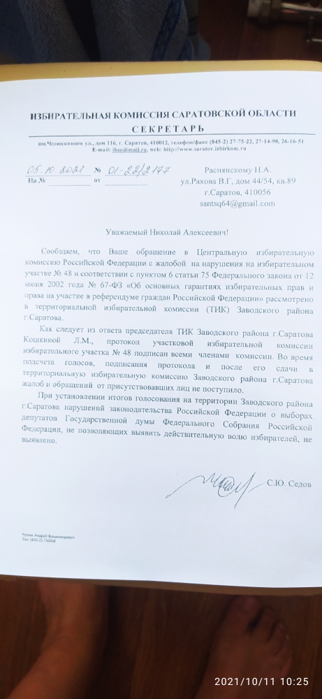 Я как член комиссии с совещательным голосом направил своё обращение в ЦИК для принятия мер и пересчета голосов. Моё обращение было перенаправлено в ТИК Саратовской области, которое как стало известно проверку и пересчет не проводило, а ответ подготовлен согласно указаний лица подписавшего ответ, т.е. С. Ю. Седова.