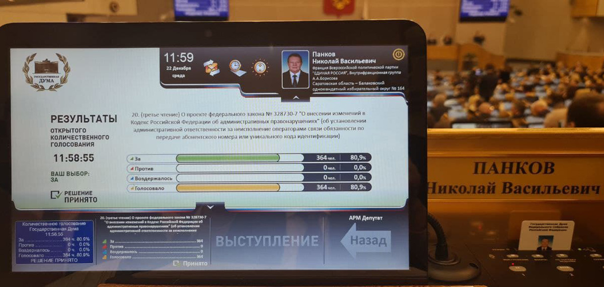 «Единогласно приняты в третьем чтении изменения в КоАП. Устанавливается административная ответственность за так называемые «подменные номера»… Госдумой был принят закон об обязанности операторов связи передавать истинный номер абонента. Как при звонках, так и при передаче текстовых сообщений. Это необходимо для борьбы с киберпреступностью и телефонным мошенничеством.