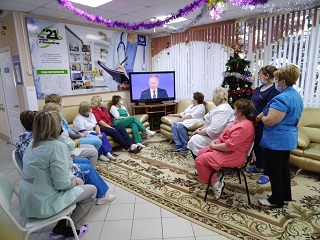 Все желающие могли следить за ходом конференции, расположившись у экранов телевизоров в зонах отдыха, уютном читальном зале, холлах отделений. Любители уединения и проживающие, ограниченные в передвижении, включили телевизоры в собственных комнатах. Многих интересовали глобальные проблемы – вопросы внешней и внутренней политики, коронавирусные ограничения и вакцинация.