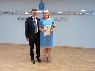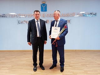 Министр труда и социальной защиты Саратовской области Сергей Егоров поздравил с победой в региональном этапе конкурса профессионального мастерства в сфере социального обслуживания в номинации «Стабильность и качество» заместителя директора дома-интерната по медицинской части Наталью Чеканову.