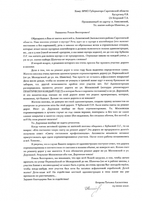 Обращаюсь к Вам от имени жителей п. Анисовский Энгельсского района Саратовской области. Наш поселок утопает в мусоре! Речь идет не о мусоре в контейнерах (его вывозят постоянно и без нареканий), речь о завалах из обрезанных веток и строительных отходов, которые лежат около мусорных контейнеров и должны вывозиться силами администрации, но….ни к 9 мая (такой великий праздник, а мы мимо мусора ходили), ни до сих пор Бубнова О.Г. так ничего для вывоза мусора и не предприняла.. Огромные завалы на каждой улице, а уж на ул. имени майора Шапочка-не передать словами!