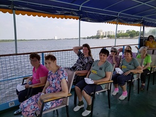 Затем судно делало плавный поворот и отправлялось в обратный путь. Всего было совершено 4 рейса, в которых приняли участие 60 проживающих дома-интерната. Умиротворяющая обстановка на борту располагала к неспешным беседам. На лицах проживающих дома-интерната сияли улыбки, взгляды были прикованы к речному простору. Желающие участвовали в фотосессии на фоне волжской глади.