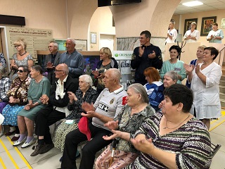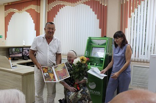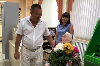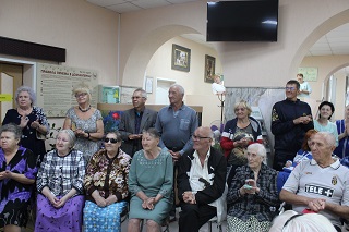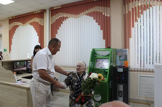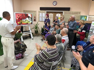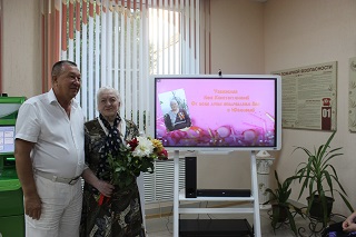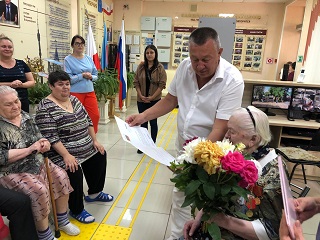 Директор дома-интерната Сергей Владимирович Сафошкин тепло поздравил именинницу и пожелал ей здоровья и долголетия. А также подарил памятный подарок и цветы.