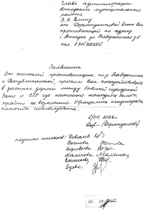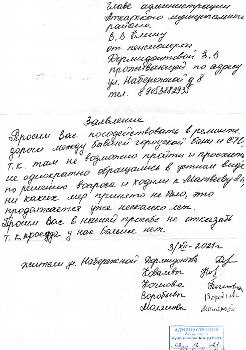 Я проживаю в городе Аткарске Саратовской области. Обращаюсь к Вам с просьбой помочь в решении нашей проблемы с дорогой. Участок дороги между бывшей городской баней и СТО, по адресу ул. Республиканская от д. № 8 до пересечения ул. Набережной. Это единственная дорога ведущая к жилым домам по ул. Набережная, состояние дорожного покрытия неудовлетворительное, особенно в межсезонный период, а так же зимой. Положение усугубляется погодными явлениями, во время дождя, даже не сильного, в весенний период, вся вода с ул. Республиканской проходит большим потоком (так как гора) по данному участку дороги, прямо к жилым домам, размывая дорожное покрытие , тоесть землю. Мы, жители данной местности страдаем от данной проблемы. В Администрацию Аткарского муниципального района обращались неоднократно, но результата нет.