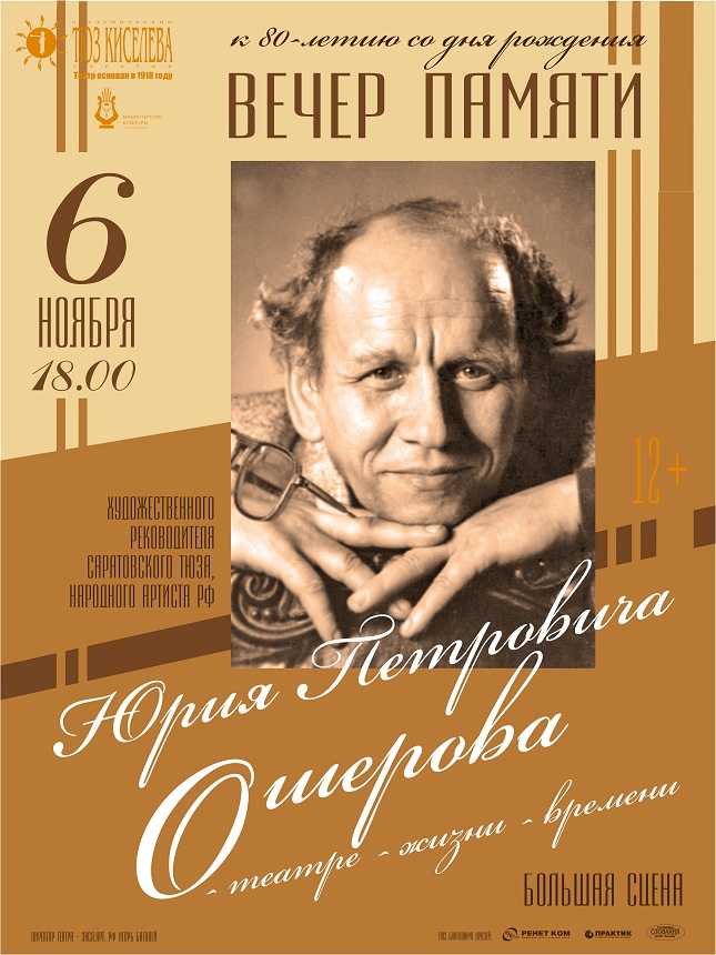 6 ноября на Большой сцене ТЮЗа Киселева пройдет вечер памяти народного артиста РФ, режиссера и художественного руководителя Саратовского академического театра юного зрителя им. Ю. П. Киселева Юрия Петровича Ошерова. Мероприятие посвящено 80-летию со дня рождения Мастера.