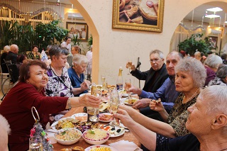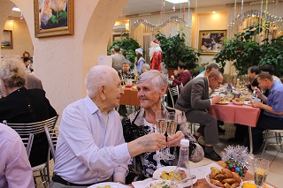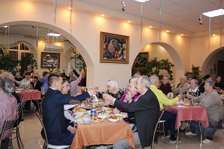 Новогоднюю ночь проживающие встречали всей большой дружной семьей, как принято, за вкусным столом под бой курантов. Директор учреждения Сергей Владимирович Сафошкин поздравил всех с наступающим новым годом и пожелал крепкого здоровья, активного долголетия, мира и благополучия. Все проживающие и сотрудники получили подарки от директора учреждения и профсоюзной организации.