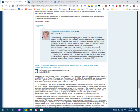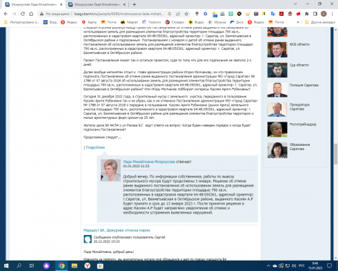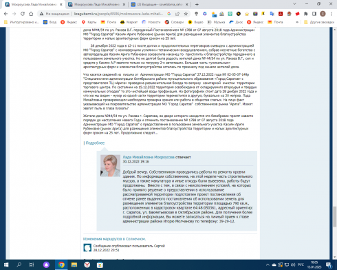 - от 30.12.2022 19:16: "Добрый вечер. Собственником проводились работы по ремонту кровли здания. По информации собственника, на этой неделе часть строительного мусора, а также макулатура и иные отходы были вывезены, работы будут продолжены. Вместе с тем, в связи с неисполнением условий, на которых было принято решение о предоставлении в использование рассматриваемой территории подготовлен проект постановления об отмене ранее выданного постановления об использовании земель для размещения элементов благоустройства территории площадью 790 кв.м., расположенных в кадастровом квартале 64:48:050361, адресный ориентир: г. Саратов, ул. Бахметьевская в Октябрьском районе. Для получения более подробной информации, Вы можете записаться на личный прием к главе администрации района Игорю Молчанову по телефону: 39-29-12".