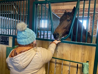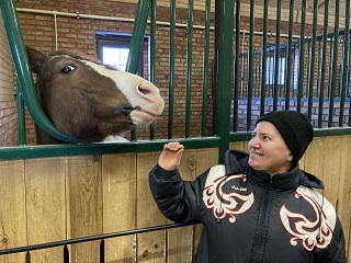 «Я очарована конем по кличке Коломбо, такие в нем величие и стать! Это представитель голландской теплокровной породы серой масти. Почему-то именно к нему я почувствовала какое-то особое притяжение, какое-то единение. Такие умные глаза, кажется смотрит прямо в душу! Вообще от сегодняшней встречи с лошадьми у меня такой душевный подъем! Так хочется творить, запечатлеть свои эмоции на бумаге, - восхищалась проживающая дома-интерната, художница Марина Кочеткова, - в голове рождаются новые образы и идеи!». После автомобильной аварии, оказавшись в инвалидном кресле, Марина заново открыла себя в живописи. Талантливая женщина работает в различной технике: живопись, карандаш, шерсть. Выставки ее творчества украшают холлы главного корпуса Энгельсского дома-интерната и оздоровительного центра «Гармония». Как отмечает художница, ей всегда нравилось рисовать животных. Одной из ее любимых созданных картин является «Конь и снег». Теперь эта тема вновь станет актуальной в ее творчестве.