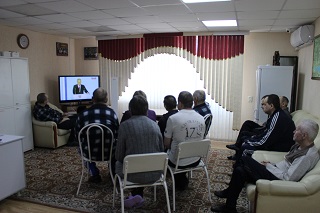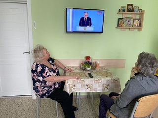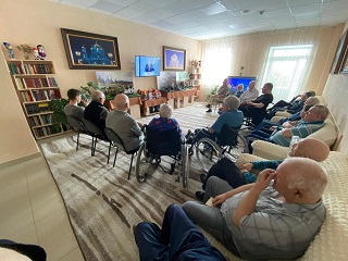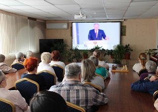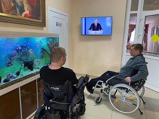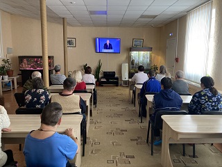 В 12:00 часов по московскому времени проживающие и сотрудники Энгельсского дома-интерната собрались перед экранами телевизоров и мониторов: в холлах, комнатах, в читальных и актовых залах. Любители уединения и проживающие, ограниченные в передвижении, включили телевизоры в собственных комнатах. Ведь как настоящим патриотам своей страны всем очень важно знать основные направления развития России, ситуацию с внутренней и внешней политикой, особенно со СВО.