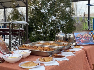 Дальше всех ждало вкусное угощение - горячий чай и блины, которые являются непременным атрибутом Масленицы. Каждый смог вдоволь отведать блинов с маслом, сгущенкой, вареньем, сметаной.