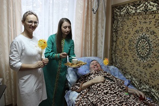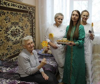 Для маломобильных проживающих угощение было организовано на местах. Девушки в народных костюмах под задорную музыку разносили подносы с блинами и медом в комнаты и холлы отделений.