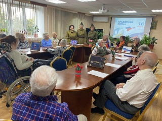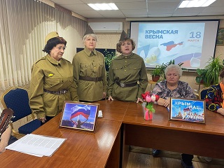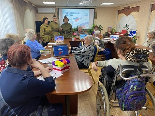 В уютном читальном зале главного корпуса собрались члены клуба любителей литературы «Лира» для встречи с единомышленниками из городского литературного клуба «Элегия». Вспоминая события крымской весны, проживающие и гости учреждения читали произведения российских авторов, пронизанные искренней любовью к своему народу и Отчизне. События в Крыму весной 2014 года были представлены на фотовыставке, развернувшейся так же в читальном зале.