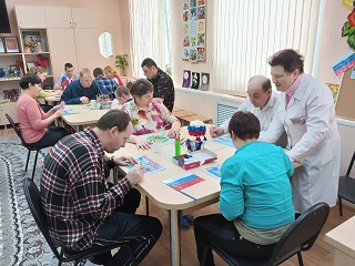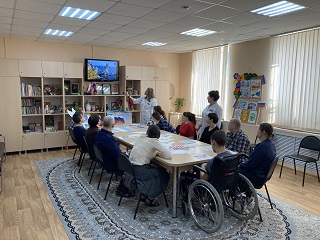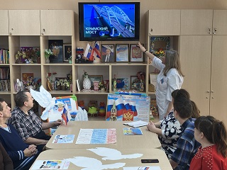 Молодые инвалиды с ментальными отклонениями, проживающие в третьем корпусе, подготовили выставку рисунков «Мы вместе». Для них прошла информативная и увлекательная беседа «Крым дорогой, вечно родной мой», в ходе которой, ребята смогли совершить виртуальное путешествие по достопримечательностям Крыма, поучаствовать в игре "Моя Родина», проявить свои творческие способности и прочитать стихи о родном крае. На широком экране ребята посмотрели историческую видео-презентацию «Крым с Россией навсегда», по окончании которой зрители с большим интересом поучаствовали в акции «Мы вместе». Самые активные проживающие поучаствовали в турнире по многоборью «Мы едины».