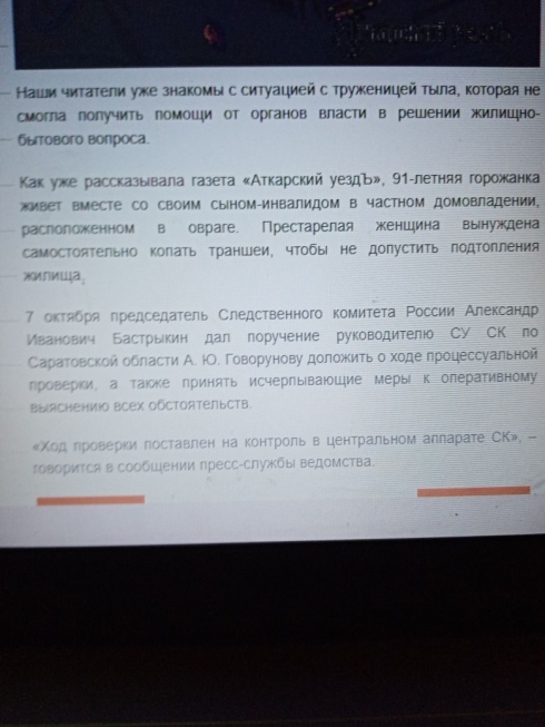 В г. Аткарске в прошлом 2022 году, с одной стороны ее земельного участка при домовладении были извлечены трубы для оттока сточных вод города, в результате она три месяца в свои престарелые годы в 91 год стояла с лопатой днем и ночью многие месяцы и меры не принимались.