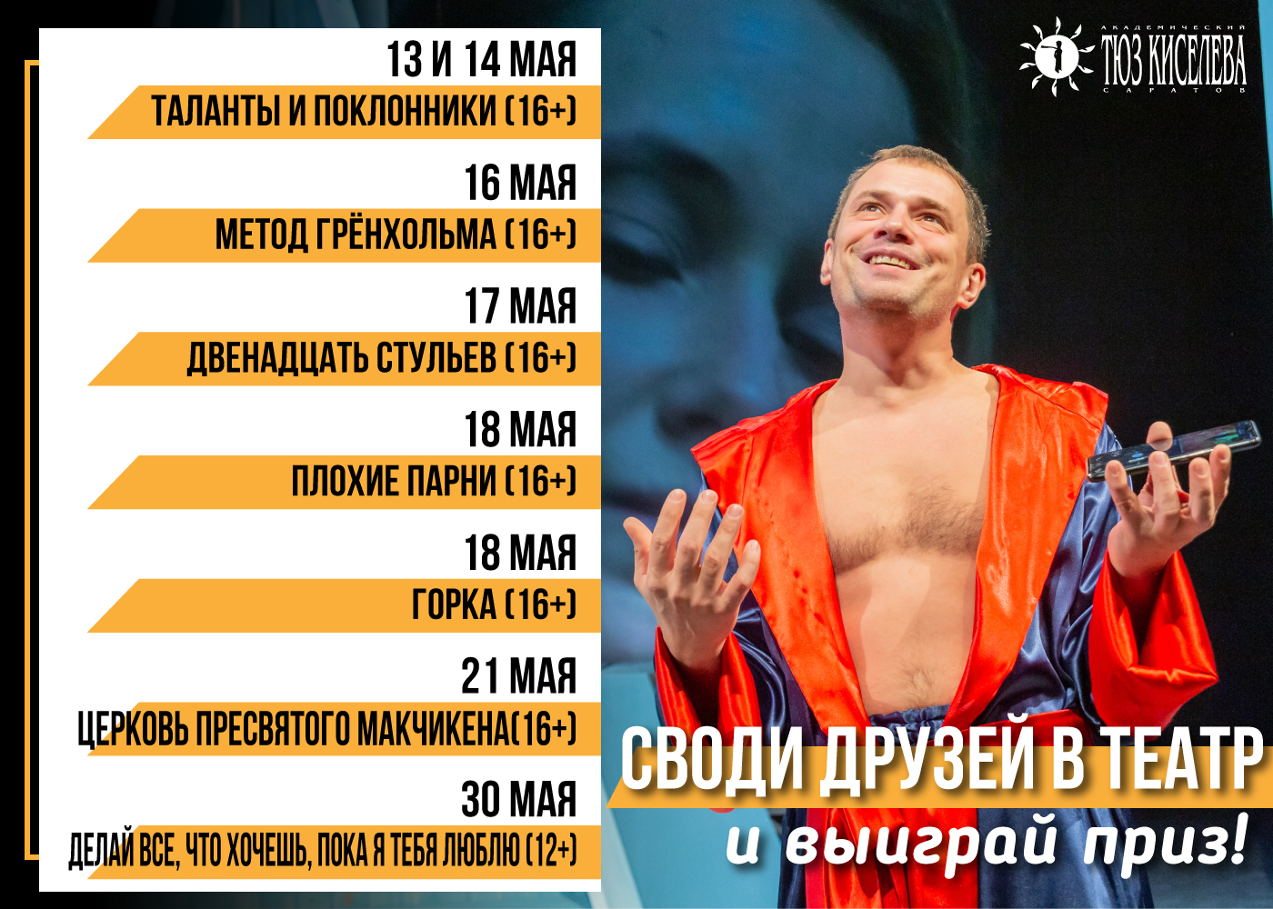 Саратовский академический театр юного зрителя им. Ю. П. Киселева бросает своим зрителям «театральный вызов»: его участниками станут те зрители, кто придет на 3 или более показа из специального майского списка спектаклей.