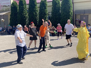 Особый интерес вызвал стенд «Наши достижения», где многие постояльцы с любопытством разглядывали новые фотоматериалы. Обратили внимание на чудесные кованые изделия, оригинально украшенные цветочными композициями. Эти удивительные работы выполнены руками проживающих третьего корпуса. Далее двинулись по так называемой «Дороге дружбы», объединяющей три корпуса учреждения. Здесь восхищались прекрасными цветочными клумбами и декоративными кустарниками, любовались деревянными и гипсовыми скульптурами, украшающими всю открытую территорию учреждения.