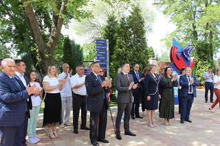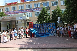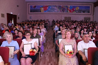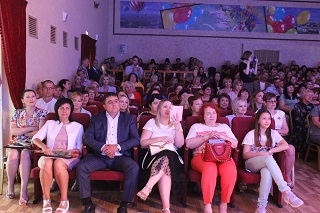 Затем почетные гости учреждения проследовали в актовый зал, который сиял от ярких красок летних цветочных композиций и благоухал ароматами роз и хризантем.