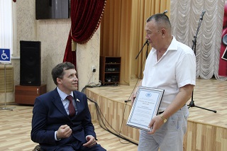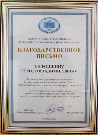 За личный вклад в решение задач реабилитации и социальной интеграции людей с ограниченными возможностями здоровья Михаил Борисович вручил директору Энгельсского дома-интерната Сергею Владимировичу Сафошкину Благодарственное письмо.