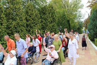 Проживающие и сотрудники интерната стали зрителями яркого и символического действия. Участники акции, под звуки знаменитой песни О.Газманова «Вперед, Россия!», сложили большой российский флаг – триколор в объемную картинку.