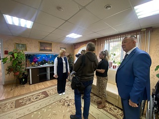 Затем гости прошлись по благоустроенной территории, осмотрели новый жилой корпус и познакомились с условиями проживания пожилых граждан и инвалидов, увидели, как организован ежедневный досуг, как проводятся мероприятия по поддержанию и восстановлению здоровья граждан, осмотрели современное медицинское оборудование, ознакомились с творчеством проживающих дома-интерната. Далее посетили уличную спортивную площадку, оснащенную тренажерами и безопасным специализированным покрытием, а также оздоровительный центр «Гармония», с оборудованной физиозоной и соляной пещерой, позволяющими гражданам комплексно безмедикаментозно поддерживать здоровье.