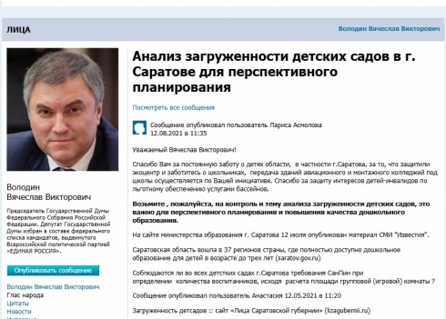 На данном портале и на е-мейл Общественной Приёмной в Саратове обращались к Вам 12.08.2021, 22.05.2023 года Анализ загруженности детских садов в г. Саратове для перспективного планирования :: сайт «Лица Саратовской губернии» (lizagubernii.ru), Загруженность детских садов. Вячеслава Володина просят проанализировать ситуацию :: Новости Саратова :: сайт «Лица Саратовской губернии» (lizagubernii.ru)