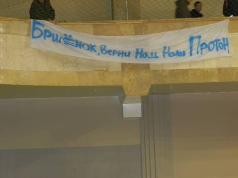 на кубковом матче ПРОТОН - ДИНАМО Казань болельщики растянули баннеры : " Бриленок верни нам наш ПРОТОН ! " " Клан Кукушкиных ,где наша доморощенная молодежь ?" " Где заботливое и профессиональное руководство ?"
